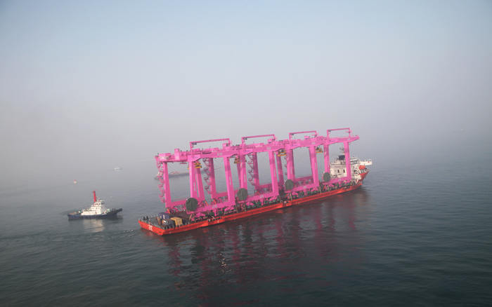 1月1日,青島海西重機為SNCT(韓國鮮光新港集裝箱碼頭有限公司)制造的8臺40噸自動(dòng)化軌道吊第一批次(4臺)順利出海,成為2017年海西重機首批發(fā)運的港機設備。