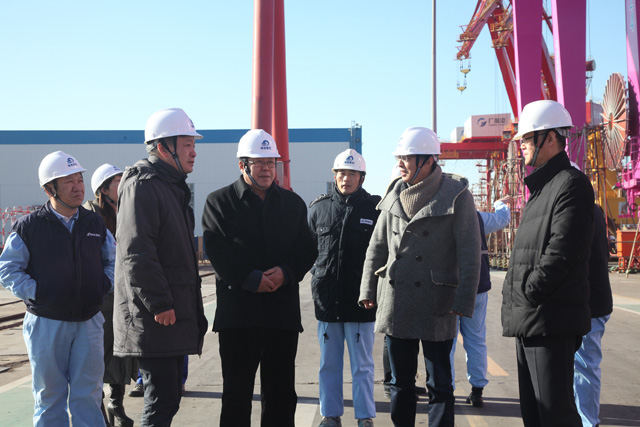 上午10時(shí)許,錢(qián)建平一行到海西重機調研。在武漢船機董事長(cháng)馬聚勇和海西重機董事長(cháng)鄧振山等人的陪同下,實(shí)地考察了海西重機港口起重機、風(fēng)電安裝船、海工平臺等生產(chǎn)現場(chǎng),重點(diǎn)聽(tīng)取了馬聚勇董事長(cháng)關(guān)于海西重機的產(chǎn)品介紹、技術(shù)創(chuàng )新及企業(yè)發(fā)展情況的匯報。