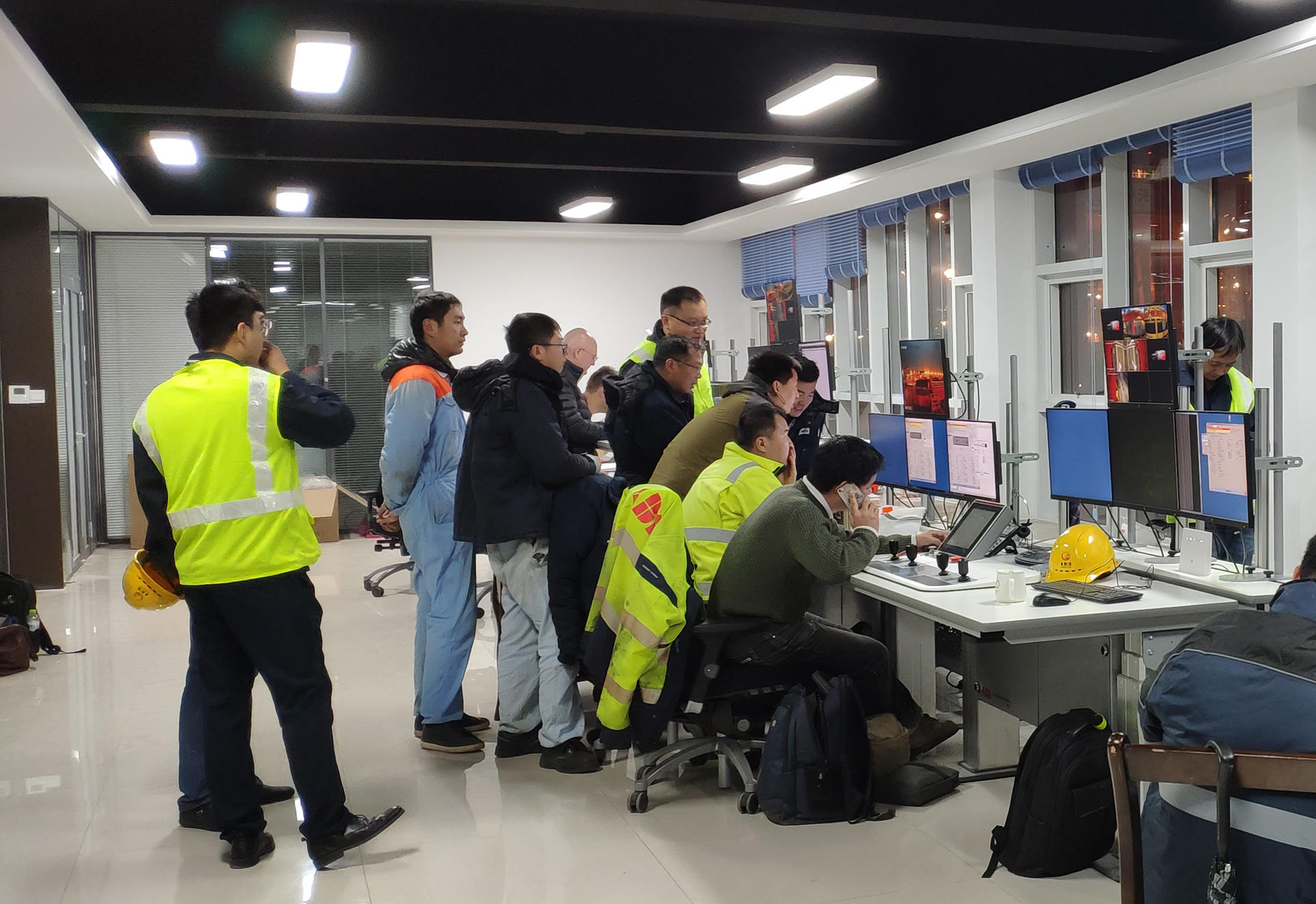經(jīng)過(guò)11月份一個(gè)月的緊張努力,運輸任務(wù)圓滿(mǎn)完成,藍圖成為了現實(shí)!現場(chǎng)調試階段,即使夜幕降臨,施工現場(chǎng)還是燈火通明,各個(gè)班組緊張有序地對當天的工作收尾,遠控中心調試工作有序進(jìn)行,不管多晚,技術(shù)人員都會(huì )對當天工作進(jìn)行總結,制定第二天的生產(chǎn)計劃。