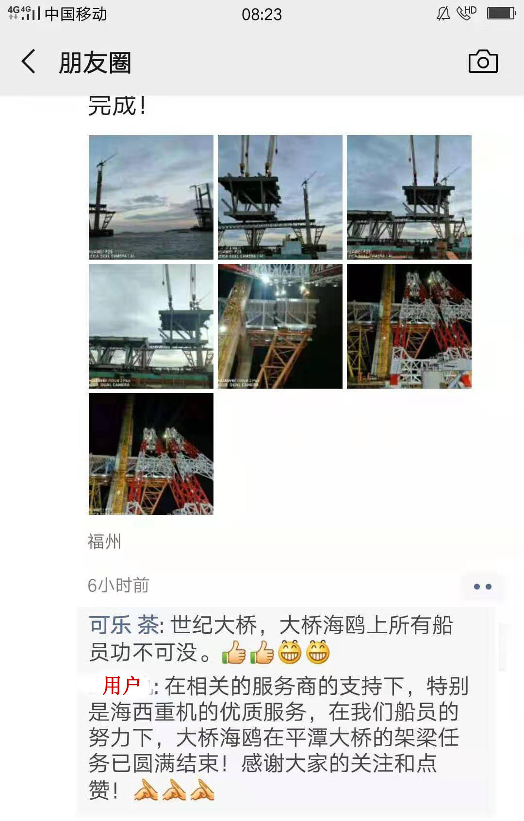 7月28日接到用戶(hù)通知,“大橋海鷗號”將于7月28日晚進(jìn)行第64、65片8鋼梁的架設(單重達3200噸),為保證工程順利實(shí)施,請海西重機安排技術(shù)人員進(jìn)行保駕護航,用船長(cháng)的話(huà)就是“你們在現場(chǎng),感到心里踏實(shí)”。公司當即安排附近正在羅源灣碼頭做電控系統改造的宋靖浩工程師,前往現場(chǎng)。7月2900日傍晚5點(diǎn),吊裝正式開(kāi)始,各崗位人員各負其責,密切配合。直到凌晨時(shí)分,2片鋼梁順利架設完成,設備運行一切正常,用戶(hù)對海西重機設備的穩定性和服務(wù)的及時(shí)性給予了高度評價(jià)。至8月6日,平潭海峽公鐵大橋,最后一片鋼梁順利架設完成, “大橋海鷗號”不辱使命,圓滿(mǎn)完成任務(wù)。用戶(hù)喜悅的表?yè)P,就是對我們優(yōu)質(zhì)服務(wù)的認可和正反饋。