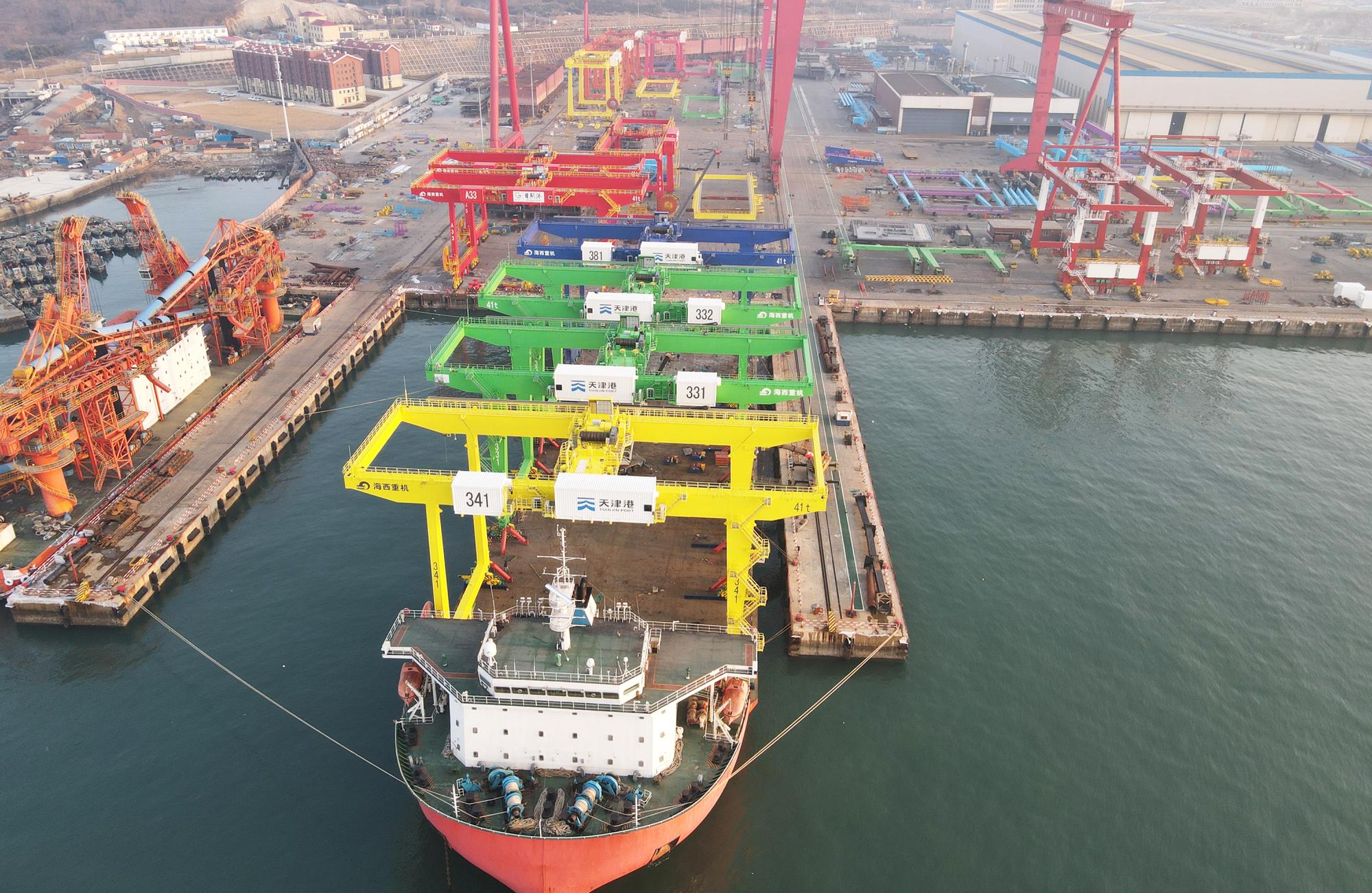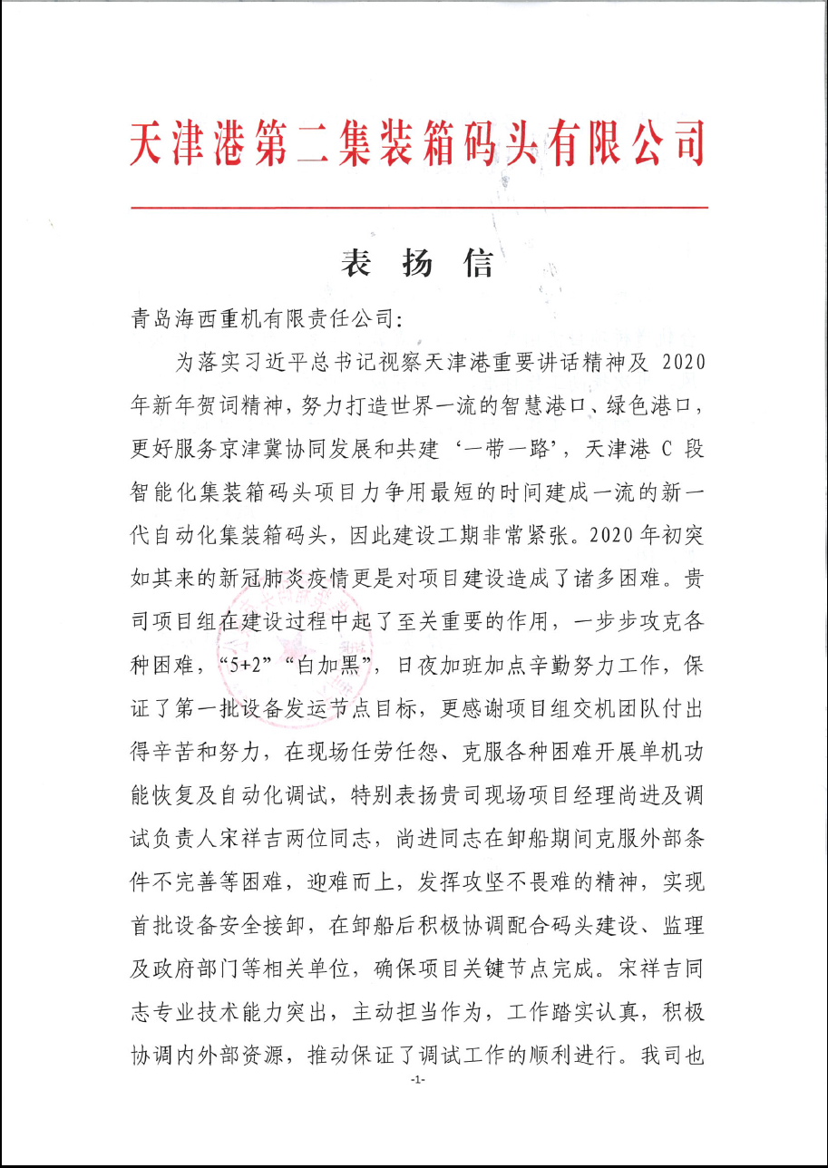 該項目第一批設備的發(fā)運正值彼時(shí)天津疫情嚴重之際,海西重機項目組交機團隊更是不畏艱難,勇于擔當作為,馬上奔赴新的戰場(chǎng)。用戶(hù)在表?yè)P信中,特別表?yè)P了海西重機現場(chǎng)項目經(jīng)理尚進(jìn)和調試負責人宋祥吉。尚進(jìn)同志在卸船期間克服外部條件不完善等困難,迎難而上,發(fā)揮攻堅無(wú)畏的精神,實(shí)現首批設備安全裝卸,在卸船后又積極配合碼頭建設、監理及政府部門(mén)等相關(guān)單位,力保項目關(guān)鍵節點(diǎn)的完成。