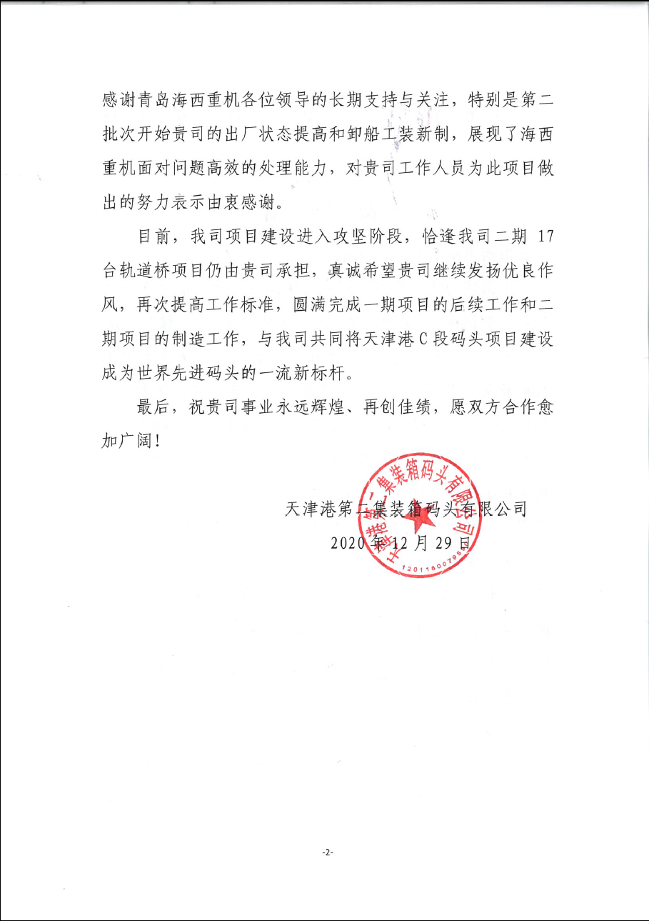 日前,中國船舶集團旗下武漢船機海西重機公司收到天津港第二集裝箱碼頭有限公司的表?yè)P信,字里行間表達出了用戶(hù)對海西重機在重大節點(diǎn)中勇于擔當,精誠合作,辛勤努力的肯定與感謝。