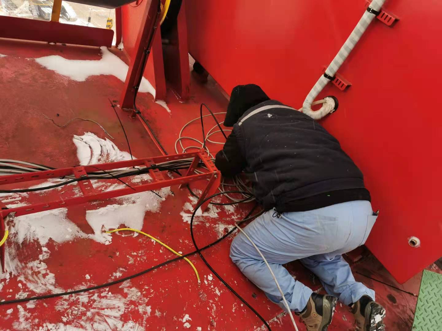 自2020年12月31日開(kāi)始,為了追趕進(jìn)度,我們團隊頂著(zhù)冷風(fēng),放棄休息時(shí)間,把臂架到機房、司機室、電氣房的電纜敷設下來(lái),進(jìn)行捆扎。為了與船廠(chǎng)穿鋼絲錯開(kāi),吃飯的時(shí)間點(diǎn)總是往后推遲。甚至為了節省時(shí)間,自己提前帶好面包,中午簡(jiǎn)單吃點(diǎn),為的就是把工作搶一搶?zhuān)粗?zhù)已經(jīng)穿到位的電纜,不禁感嘆隊友們的拼勁兒。