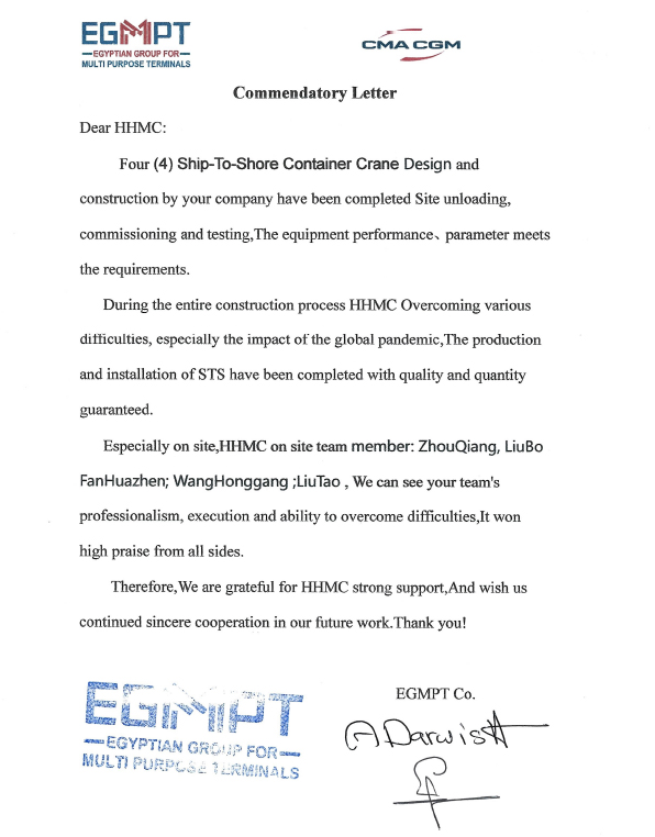 亞歷山大港多用途碼頭為埃及國家重點(diǎn)項目,埃及國家領(lǐng)導人員高度關(guān)注該項目進(jìn)展。岸橋到達用戶(hù)碼頭后,項目組嚴格按照策劃節點(diǎn)穩步推進(jìn)每天工作,確保當日事當日畢,最終在整個(gè)項目組通力協(xié)作以及用戶(hù)的積極配合支持下,岸橋順利完成交付,并按計劃進(jìn)入保產(chǎn)。期間,埃及總理、交通部部長(cháng)對海西重機產(chǎn)品及現場(chǎng)項目團隊給予了充分肯定,多家當地媒體對此進(jìn)行了專(zhuān)題報道。用戶(hù)特地向我司發(fā)來(lái)一封表?yè)P信以示感謝。