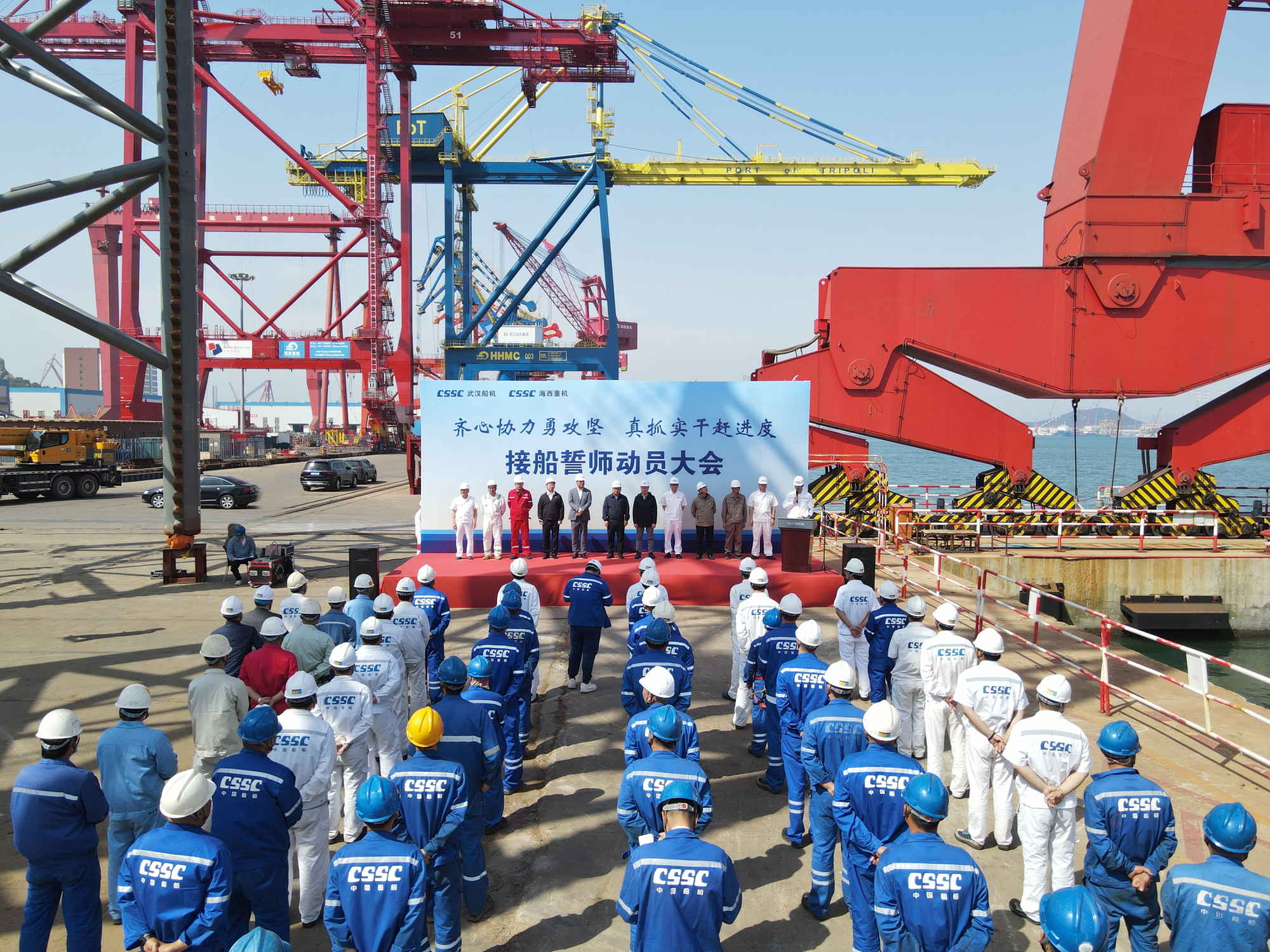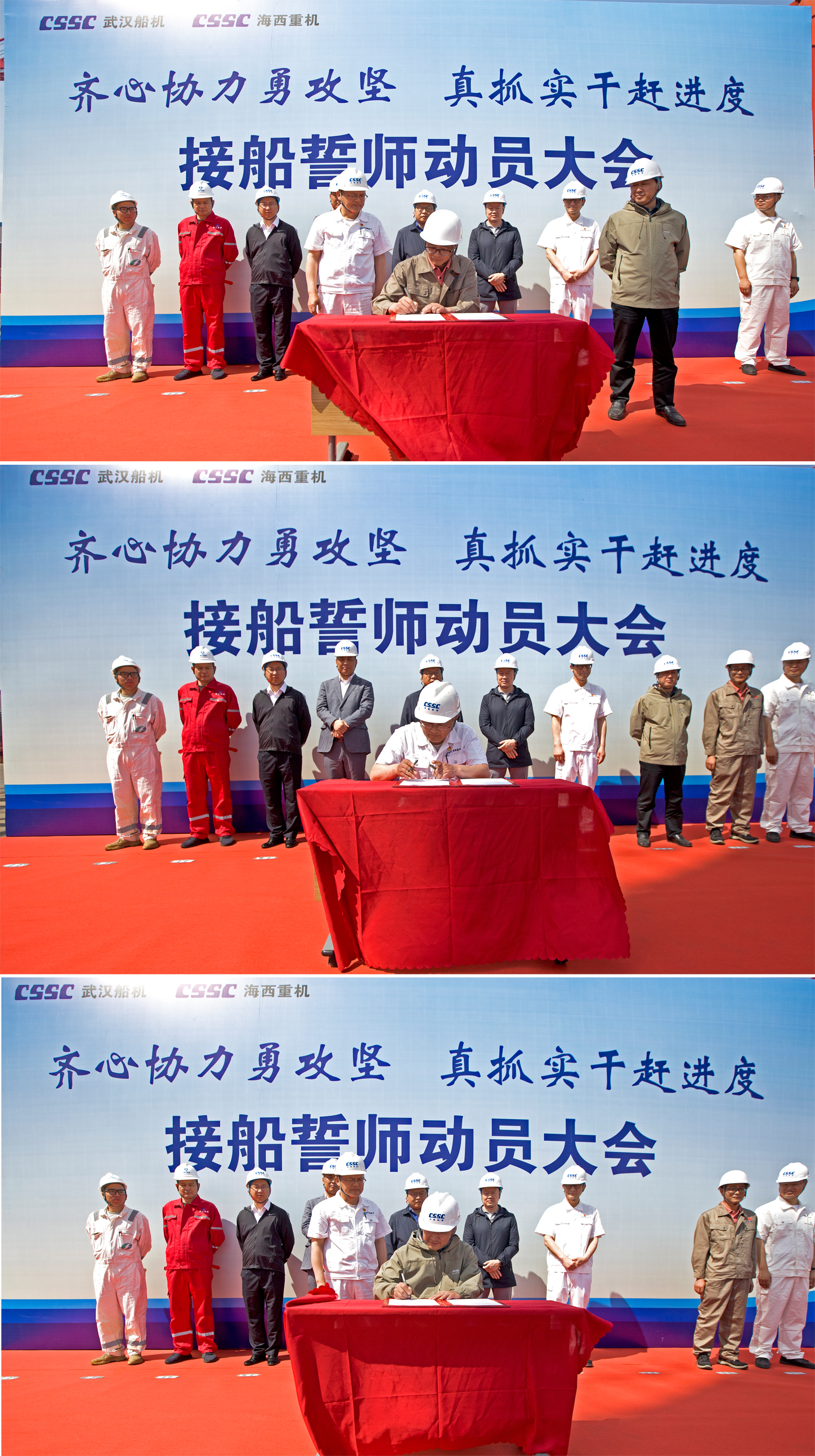 為了明確目標、凝聚共識、齊心協(xié)力、克難攻堅,亮明迎難而上的堅定信心和堅強決心,動(dòng)員全員上下持續營(yíng)造濃厚干事氛圍,掀起“齊心協(xié)力勇攻堅,真抓實(shí)干趕進(jìn)度”的高潮,全力以赴打好海工項目集中攻堅戰,5月25日上午,中國船舶集團旗下武漢船機海西重機公司在生產(chǎn)現場(chǎng)組織開(kāi)展接船誓師動(dòng)員大會(huì )。華夏金融租賃有限公司、北京神大集團有限公司、飛勵特船舶管理有限公司、大津重工泰州分公司、江陰雙馬重工裝備有限公司、武漢船機海西重機等相關(guān)方參加本次動(dòng)員大會(huì )。