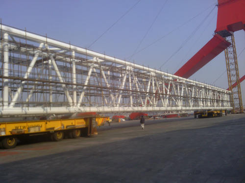 F1是我公司承造的3600T雙臂架變幅浮式起重機項目。臂架中段單片長(cháng)113米,寬4.5米,高7米。鑒于該構件超長(cháng)超重,我們采用兩臺平板車(chē)協(xié)同作業(yè)的方案。