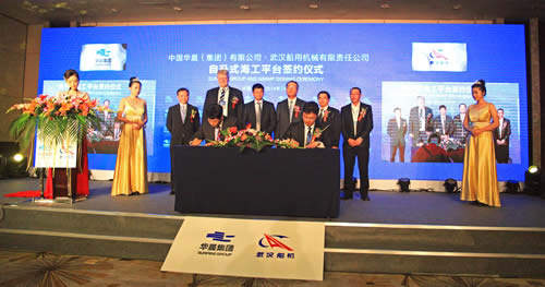 2014年7月2日,武漢船用機械有限責任公司與東方華晨集團,在青島海西灣青島海西重機舉行了10臺自升式海工平臺項目的合同簽字儀式。武漢船機董事長(cháng)何紀武、東方華晨集團主席程立新先生等出席了簽字儀式。