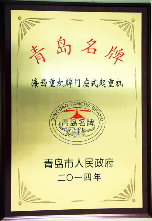 近日,海西重機門(mén)座式起重機被青島市人民政府授予“青島名牌”榮譽(yù)稱(chēng)號,并頒發(fā)證書(shū)。