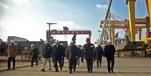 許克振一行實(shí)地考察了海西重機生產(chǎn)現場(chǎng)及組裝發(fā)運現場(chǎng),參觀(guān)了包括韓國批量岸橋、自動(dòng)化軌道吊等在內的港口機械設備及在制的批量自升式海工平臺項目,看望慰問(wèn)了生產(chǎn)一線(xiàn)干部職工,并在隨后召開(kāi)的中船重工青島海西灣基地相關(guān)企業(yè)負責人座談會(huì )上,聽(tīng)取了海西重機董事長(cháng)孫總關(guān)于企業(yè)產(chǎn)品結構、技術(shù)創(chuàng )新、生產(chǎn)經(jīng)營(yíng)及中長(cháng)期發(fā)展規劃等方面的情況匯報。